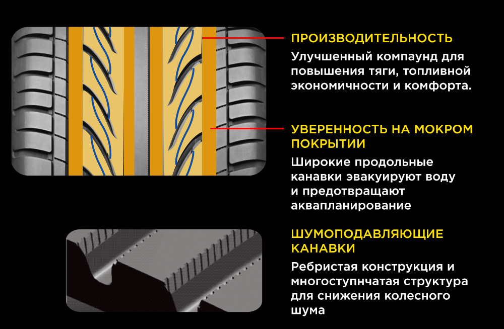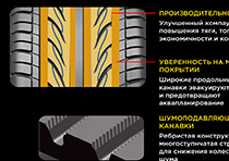 Протектор изготовлен из оптимизированной резиновой смеси. Ее отличительной особенностью является повышенное содержание силики. Этот компонент придает резиновому составу одновременно и эластичность и повышенную устойчивость к любому механическому воздействию. В результате шина отличается хорошим сцеплением на мокрой дороге, износоустойчивостью и мягкостью хода. Кроме того, нельзя не отметить присутствие четырех продольных канавок, делающих сцепление на мокрой дороге еще более надежным.